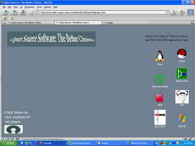 Like James, Chris entered the class with considerable web development skills. He knew HTML, Macromedia Dreamweaver, Adobe Photoshop, and Macromedia Flash. Unlike Karin, Chris had little trouble executing his design ideas. Chris' big challenge was to identify a viable research project that could hold his interest for 8-10 weeks. The design for Chris' project on operating systems and the open source movement is a fascinating example of content-driven design. The layout for Chris' hypertext consciously evokes the desktop layout for a PC running either Microsoft Windows or Linux.