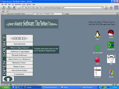 Chris used Macromedia Flash to create an interactive navigation bar that evokes the Microsoft Windows start menu. Instead of a start button, however, Chris provides the an edited version of the icon for the open source movement. Click the icon, and site navigation appears on the "desktop" (screenshot 2).