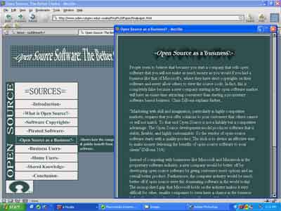 Chris' design, like Karin's, is very experimental. Yet the design remains transparent to the reader precisely because it mimics conventions of OS interface design. Once the reader identifies the starting point for the hypertext, navigation becomes very familiar. Select a link from the "start menu" and a new window pops up on the desktop in the same way that Windows or Linux might launch a new program (screenshot 3).