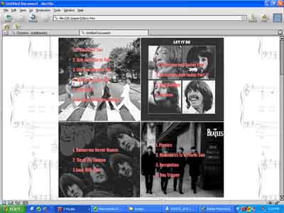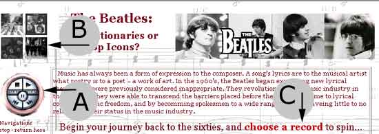 Christine's hypertext is the most clearly multilinear of the projects included here. An overview of the navigation options reveals the multiple paths through "The Beatles." As screenshot 2 shows, the reader can use the media player "skin" to navigate (A), go directly to a specific main section of the hypertext by selecting from among the four thumbnail images of album covers (B), or enter the hypertext by following the text-based link (C). This multi-layered arrangement for navigation can only be accomplished with a clear (yet flexible) conception of relevant relationships between the individual nodes of a hypertext. While the organization of this project is not linear, Christine has an organizational structure in mind. Christine is able to draw on this structure, what Shauf (2001) calls a "logic of space," to build navigation options that are not strictly linear while remaining meaningful to the reader.