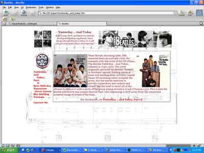 "Begin your journey back to the sixties, and choose a record to spin" (Malita, 2003). Only an author conceiving a content-driven web design would refer to hypertext navigation as spinning a record. Christine's hypertext on the music of The Beatles is effective in part because of its fascinating placement of digital images alongside analog language. How can one use an audio player skin, itself a virtual representation of physical hardware, to play vinyl? And what is being played in the hypertext? The structure of Christine's hypertext is represented as a series of songs organized into one of four albums or "records." Each thread of the argument, then, is visually represented as a set of tracks on an album. Christine's hypertext is a clear example of a feature of visual rhetoric in web design that Mary Hocks (2003) calls hybridity. It appears that the only parts that are missing here are accompanying audio files. How fitting, then, that the background image for the entire site is a lyric sheet with Beatles songs! There is nothing to hear. Still, it is possible to read the tracks on the records. The juxtaposition of image and imagery, the visual and the textual, is not confined to the larger structure and design of the hypertext; it is woven throughout the project. Each node brings together a textual argument and relevant images that help configure meaning. In screenshot 5, for example, the images that frame the text illustrate a point Christine makes in the text.