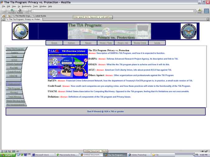 James' project draws heavily on established web design conventions. The layout, use of graphics, and navigation visually indicate that the hypertext is a resource for information on the TIA Program. In sharp contrast to Karin's hypertext, James' design produces a relatively "transparent" hypertext in the sense that he meets readers' expectations about web design and navigation (Hocks, 2003). return to James| hybridity | multilinearity?