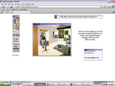 In Karin's hypertext we find an argument about visual art constructed largely through the use of images. Many of the textual elements of the hypertext are limited to brief assertions about relationships between pop art and women. These assertions function as verbal lenses that help configure (Drucker, 2002) the reader's interpretation of the visual elements of the hypertext essay. If the mouse-over in screenshot 4 added complexity to textual claims already on the page, the hover-effect in screenshot 6 leads the reader by creating incongruities. The hover effect is visual. Its placement alongside the text-based effect on the same image suggests that the two work together. Where the text claims that art is too complex to reduce to representations of sexual difference, however, the new image is not a clear illustration of that idea. Karin's hypertext eases this tension with an invitation (found in the image's caption) to explore more Hamilton by following a hyperlink on the image.