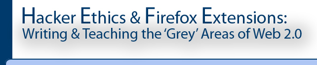 Ethical concerns as they relate to writing and technology are of course not new. Composition, multimedia writing, and professional communication classrooms, where the influence of digital advancements such as Web 2.0 continue to be felt, offer environments for “keeping ethics, rhetoric, and writing together as an intertwined set” (Porter, 1998, p. 23). Ultimatel,y I wish to demonstrate that pedagogically such teachers do not have a choice. As James Porter (1998) remarks, “When one writes, one decides. Writing is an action involving an ethical choice about what one is to be and what one is to do. At the point when you begin to write, you begin to define yourself ethically” (p. 150). Porter’s book, Ethics and Internetworked Writing, which is now more than 10 years old, contains the warning that “we are in an ethically sensitive and important time right now because what we as users (and as teachers of users) do on the networks will help constitute the norms for such discourse as they become stabilized and legally sanctioned (or not) in the future” (p. 8). Web 2.0 has ratcheted-up the sensitivity levels by enabling a larger group of users to engage with more data and test the limits of how and how much of that data is used. Because an increasing number use Web 2.0 technologies and in essence have joined a community of writers/hackers, advocate moving beyond just modeling ethical online behavior and using the classroom as a space to introduce hacker ethics. I focus on two new Web 2.0 extensions – Web Developer and Greasemonkey – for the open source browser Firefox that I believe extend an unprecedented invitation to remix, hack, manipulate, and even sabotage content. These two extensions and the activities they enable are discussed within the framework of white, black, and grey “hat” hacker ethics.