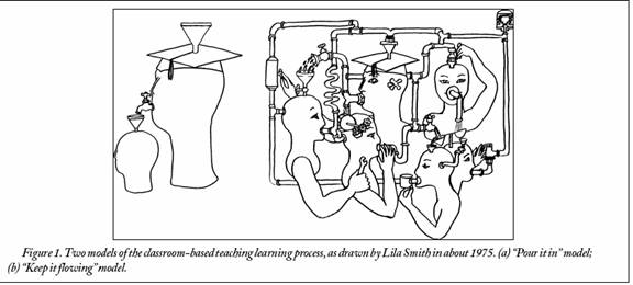 Interestingly, the same document presents another, somewhat antithetical, visual representation of student engagement: Figure 1 (borrowed from a 1975 article by Lila Smith contrasting the "pour it in" with the "keep it flowing" model of education) is striking for its lack of Tayloresque management tropes: