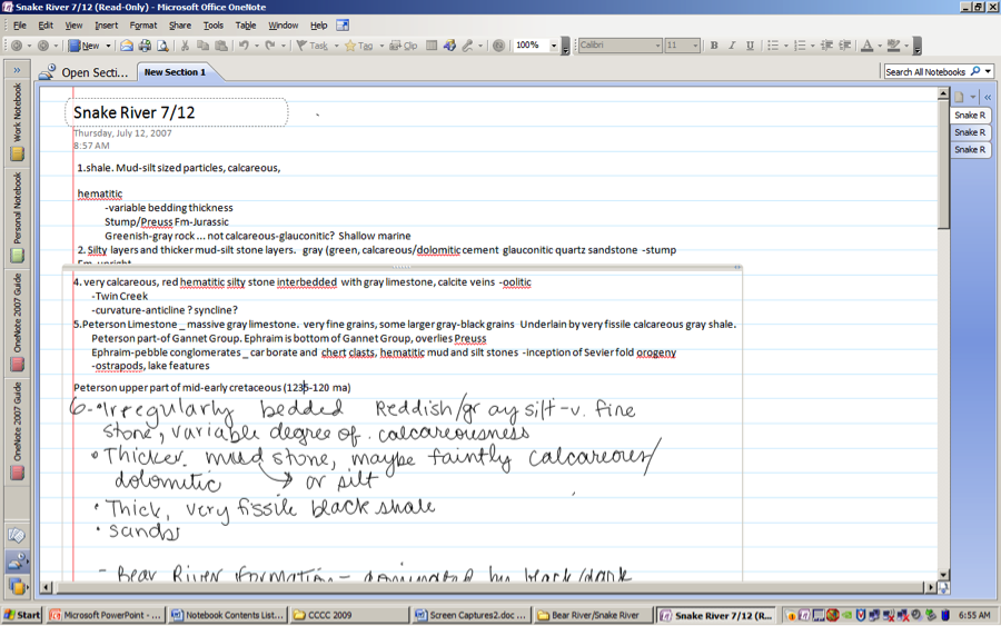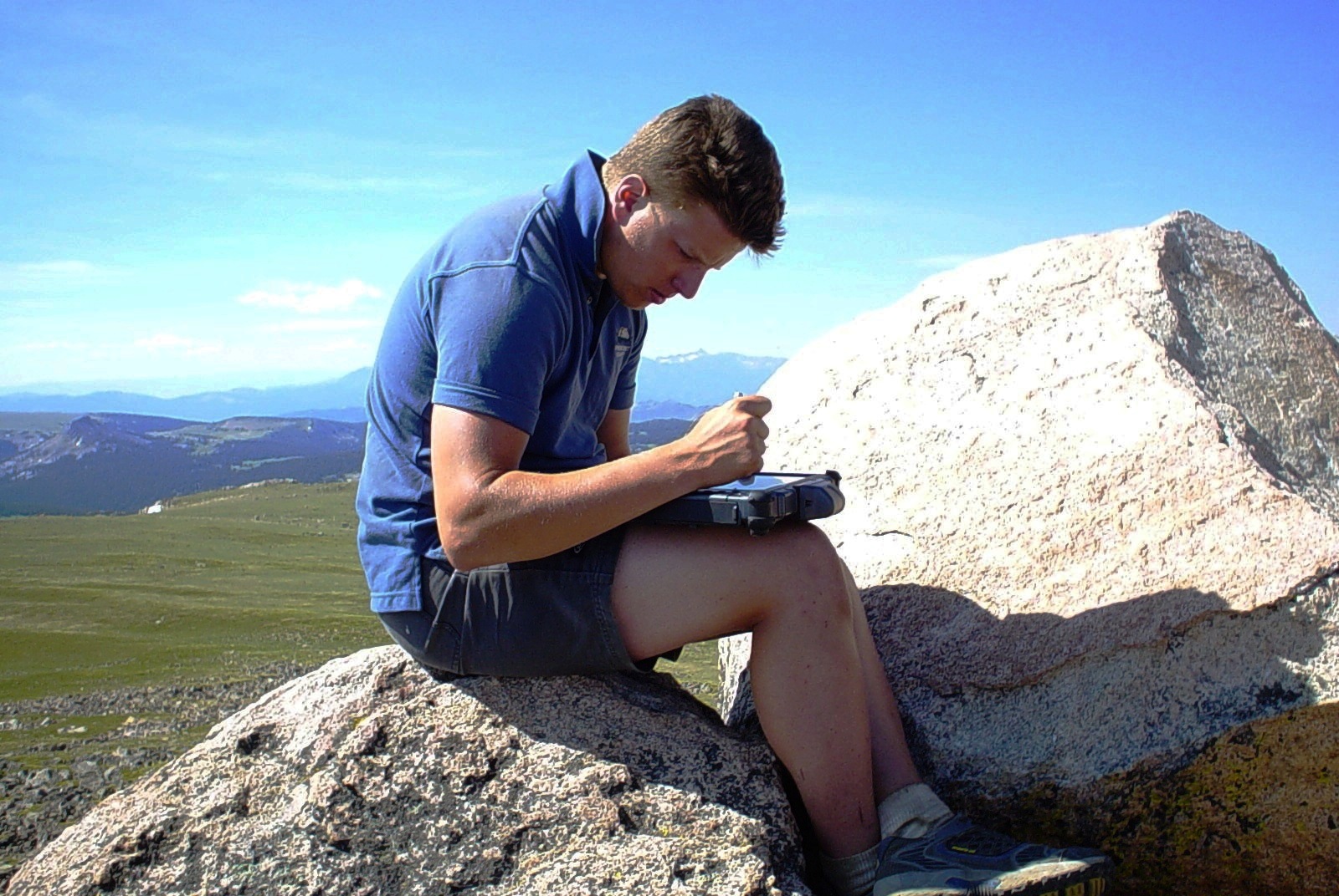 Two summers later, I made a second trip out west, to Jackson Hole, Wyoming, and surrounds with a different group of geology students from the University of Michigan who actually did use specially designed Geopads to compose digital field notebooks. Geopads are tablet PCs loaded with Microsoft OneNote software, along with GPS mapping tools and a variety of other programs, including email capability. They can be strapped to the upper body in a sling-like, canvas support system that allows for both note-taking and safe hiking and climbing in rugged locations.