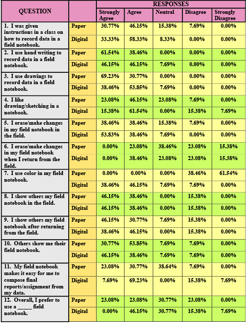 The following survey results rendered in tabular form were collected from University of Michigan geology students using an online survey I composed and made available to them at Survey Console, www.surveyconsole.com.