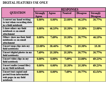 Compared to traditional field notebooks regularly used by geology students, and apart from providing the striking multimedia and communication advantages mentioned earlier, digital field notebooks also possess certain inherent, shared characteristics with traditional manuscript field notebooks. For example, both fulfill users’ common social motivation to perform a task required in an institutionalized situation, and answer their need for personal identification with the members of a professional community. Within the geology discourse community, both construct raw data for several future forms of communication within that community, within the wider scientific audience, and at some point in the communication channel, even with the general public. And both exhibit some characteristics of what Peter Medway (2002) has called a “fuzzy genre”: striking diversity in physical format; internal organization; the amount of use; the amount, type and style of drawings; the relationship between drawing and text; and patterns of textual and linguistic organization. Students are instructed in both cases to keep their notes and drawings “organized and legible,” yet I found no formal or replicable pattern of organization to appear in either of the two types of field notes.