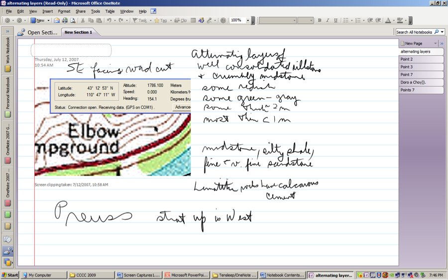 After taking to the road, we stopped to orient students to the devices and had some difficulty due to inconsistencies in equipment software versions. Students opened the Visual GPS program and the ArcGIS program, which when integrated, allow students to tap with a stylus on sections of their maps and receive location information such as coordinates in pop-up windows. They can also enter information themselves to the maps in this manner. Next they were briefly oriented to the software they would be using to inscribe field notes—Microsoft OneNote. The insert menu for OneNote allows for embedding of video, audio, digital photos and other files; screen clips from the web or other mapping applications and files; and blogs to include commentary from other users, should they choose to post their field notes to the web. However, sadly, none of these features were used or encouraged to be used during field work; it was as if the old medium of the traditional field notebook were simply being poured into the new, as is so often the case with migration from one medium to another (Bolter 1999). Very little remediation of the notebook seemed to be given any thought. One feature which did receive some attention from the instructor was text recognition, which converted students’ handwritten text to print, and in examining their digital notebook files I found that one or two students tried this occasionally, but then returned to their own handwriting for the remainder of the trip. Most felt the text converter was too labor intensive, and didn’t feel there was much value added.