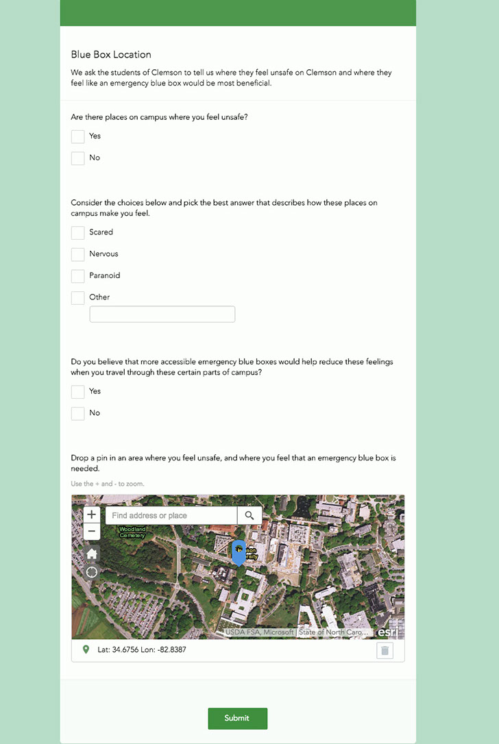 In this survey, students tackle the problem of safety on campus by attempting to locate where students feel unsafe in specific spaces and places.