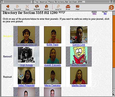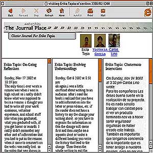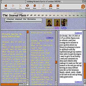 When students log-in to the Cluster Journal, one of the first things they view is their class. Reinforcing online community and team building, students can read each others' journal. The Cluster Journal is based on clusters of three students. This design allows for students to form a close-knit intellectual community over the term of a course. The pedagogy and design of this journal literally makes three journals in one. Only in the cluster of three can students write and respond to their clustermates' ideas. Teachers can shift students from one cluster to another or from one class to another. This allows pan- and cross-disciplinary teaching possibilities. It also allows teachers to shift cluster groups based on evolving classroom themes and novels. |