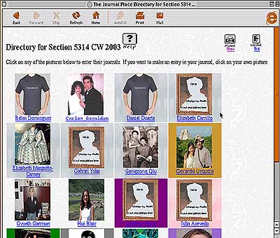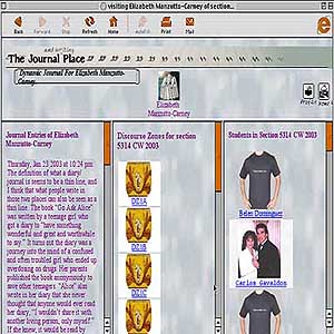 Common to all journal environments is community. Students in the Dynamic Journal (DJ) can view their classmates' pictures or custom artwork or go right to their journal (Picture A). Once they are in the dynamic classroom, they can write in their personal journal (left side), and view and read their classmates' journals (right side). This allows for various pedagogies in which students read each others' journals (Picture B). The Dynamic Zones (center column) offer a wide range of teaching possibilities. Teachers can create as many Dynamic Zones as they need, can customize each one by name, and by inserting a visual, such as the jacket cover of a novel under discussion. Teachers use Dynamic Zones for writing workshops, collaborative groups projects, focused and whole class discussion areas. The Dynamic Zones have proven to be flexible to many pedagogies (Pictures B and C).