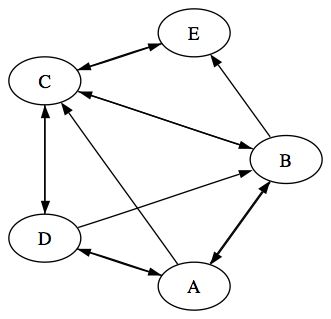 Note. Bloggers A through E are part of a network where each is connected to the other either directly or indirectly, by either being a reader (and providing outward links) or by being read (and receiving incoming links). For instance, C is read by A, B, D, and E and also is a reader of D, B, and E. Blogs A and E in this model are not directly connected to each other; however, there are several paths users could take to get from one to the other using other blogs as points of departure and entry. The blogs in this study fit this simple network model.