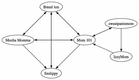 Note. This graph shows the primary links between the blogs; it does not represent all the existing secondary (or tertiary, etc.) links that further connect the writers to one another in small-world fashion. Each blog chosen satisfies the study specifications and has a link in the sidebar.