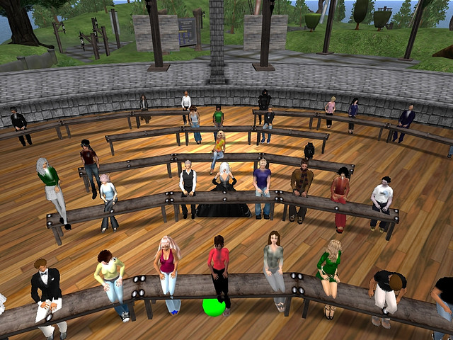 Participants listen to anthropologist Tom Boellerstorm speak at the Virtual Worlds--Best Practices in Education conference in Second Life in 2009