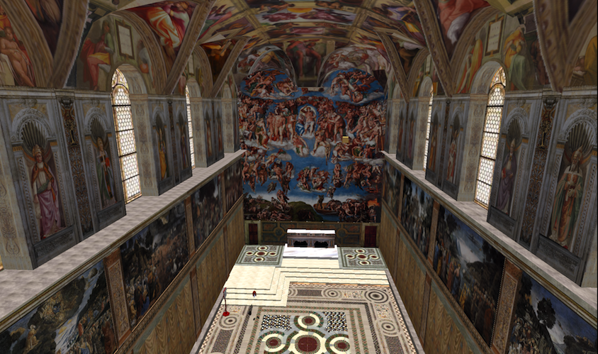 If you bring your Second Life avatar here, you can take a tour in a gondola around the grounds and you will be shown all the highlights of the island. Not all of it resembles the actual campus, but nevertheless strives for a realistic rendering. One of the most celebrated parts of the virtual campus is a replication of the Sistine Chapel. From a transcript of an in-world tour posted on YouTube (2007), the tour guide speaks: