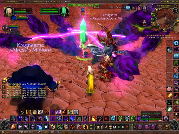Game interface for a warlock, including numerous spellsLike Natalie, Charlene also was driven to play games by a desire to achieve and accomplish goals. When asked to describe her perfect videogame, she wrote, “The perfect videogame would have simple tasks to accomplish while having fun . . . this would be entertaining as well as something that people would strive to play due to the fact that they could accomplish levels.” Because both Charlene and Natalie derived so much pleasure from setting and achieving goals, it would seem that Charlene should have enjoyed WoW as much as Natalie. However, this was not the case. Charlene was extremely frustrated at the game mechanics and gaming literacies needed to play WoW successfully, which was exacerbated by the fact that she played a warlock, a more technically difficult character to play because players must control a pet as well as a central avatar. She wrote, “I don’t like games that are very confusing and detailed like WoW. I don’t really understand the point behind the game, whereas with other games such as Super Mario 64, there are defined levels, and once you beat a certain path, you go up a level and it’s completely different from the level you had just beaten.“ So, even though WoW is actually her ideal game—a game in which the player does finish concrete tasks in order to achieve higher levels and gain access to new parts of the game—she was so thwarted in her desire to achieve by the technical aspects of the game that she could not see this.