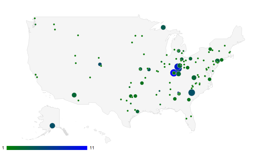 Click here to download a static image of this mapThe Ohio State University (67 participants, 9 years) has been excluded from this data