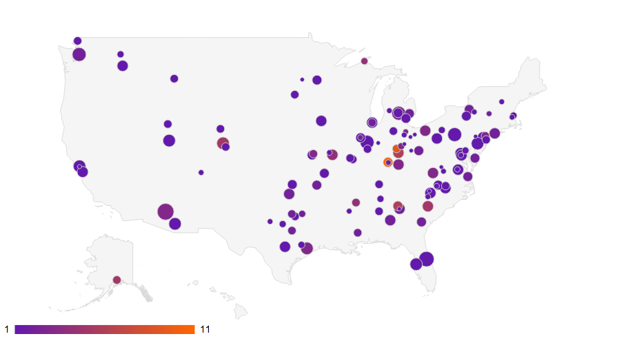 Click here to download a static image of this mapThe Ohio State University (67 participants, 55014 population) has been excluded from