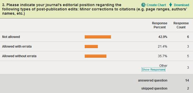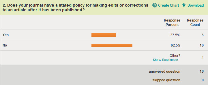 A majority of the online journals in the survey (62.5%) did not have explicitly stated policies for edits or corrections to published texts, a result that may reflect the very small number of times such requests are received.