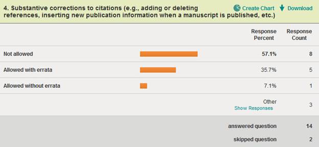 The results here are interesting, showing some variation among editors and a general awareness, for the most part, that substantive corrections within reference lists should be handled differently than minor ones. In question 3, the most striking result is that nearly as many journal editors (35.7%) would make minor citation changes without errata as would refuse to make them altogether (42.9%). One editor commented that “For online documents, we update links as needed and indicate that the links have been updated,” while another stated quite directly, “We don't do errata. If somebody catches an error (of any size), we'll change it.” Those editors who would not allow these changes did not explain why, but many of them — as will be seen in the responses to question 10 — do not believe that editorial changes of any sort should be allowed after publication. In question 4, which asked about addition, deletions, and somewhat more substantive revisions to existing items in works cited lists, the respondents were a good deal more restrictive, with 57.1% saying they would not allow such changes at all and only one editor indicating changes could be made without errata.