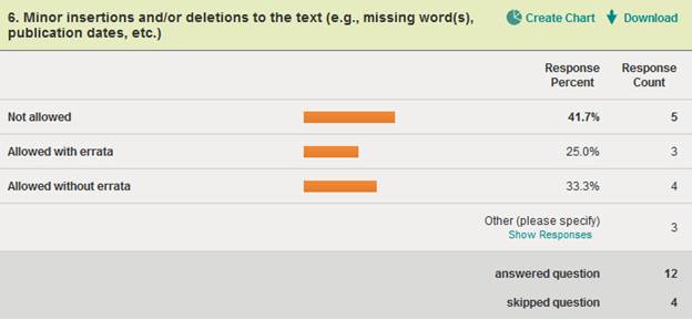 Curiously, journal editors overall appeared to be slightly less concerned about making minor edits to an article’s text than they were about making similar changes in reference lists. Half of the editors said they would feel comfortable correcting simple typos and punctuation errors without errata, and a third indicated they would do the same with minor additions and deletions to the text. As with the citation questions, there is a clear shift to more restrictive policies (or more explicit use of annotations) as the edits impact meaning, but the overall balance of percentages is closer to the results of question 3 than question 4.