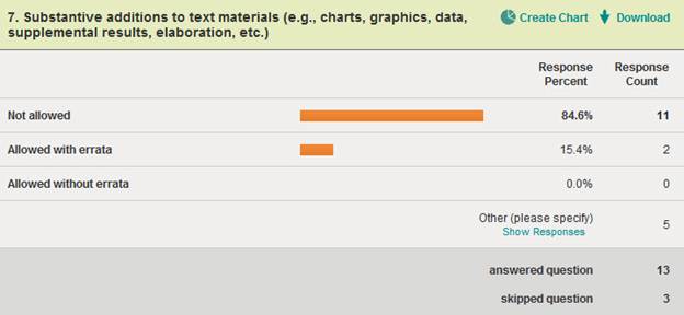 One change that authors might want to make to their published work would be to add new or supplemental material, possibly because they wish to share data gleaned from new research, enhance their original presentation with graphics, or even explain an argument or train of thought more fully. Question #7 asked editors to consider whether this practice should be allowed.