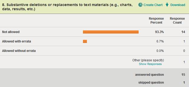 In question 8, editors also rejected the idea of deleting or replacing existing text, and to an even higher degree (93.3%) than they did the addition of material. Only one journal indicated it would permit these changes, and even then only with errata. One reason for the stronger degree of rejection here, I think, has to do with a concern for editorial transparency. While adding material might alter some aspects of a document, none of the original content would be excised; it would still be available for readers to view. Deleting or replacing text, on the other hand, would remove content from the manuscript and might therefore be perceived as a more significant (and slightly suspicious) change.