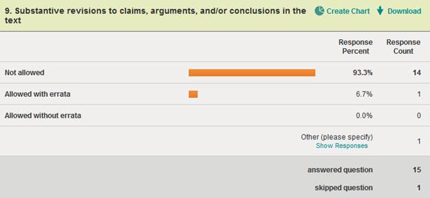 Responses to question 9, regarding revisions to an article’s central claims, arguments, and/or conclusions, were identical to those in question 8. As a group, the majority of journal editors indicated they would not allow authors to revise texts in ways that substantively affected or changed the original meanings. Even so, one respondent (in a comment added to question 10) suggested he had at least some openness to changes that significantly altered a text’s claims and/or conclusions, saying “If there were a truly substantive revision, I would probably replace the original text with one labeled "version 2.0" or similar (with a revision date included).”