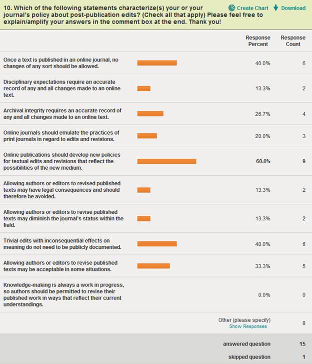 This question served multiple purposes: (1) it asked editors about general beliefs on the issue that could be correlated with responses to earlier questions in the survey, (2) it asked about their sense of responsibility to the discipline, to archival integrity, and to the journal itself, and (3) it asked whether digital journals should follow the practices of print journals or find ways to develop their own frameworks for publication and revision.