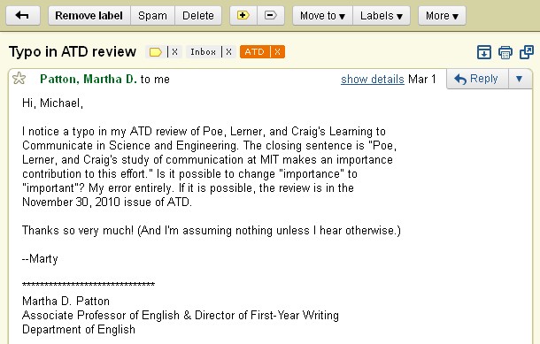 The request described in the first scenario is similar to one I received in March 2011 from Martha Patton regarding a piece she had published some four months earlier in the online journal Across the Disciplines (email reproduced with permission)