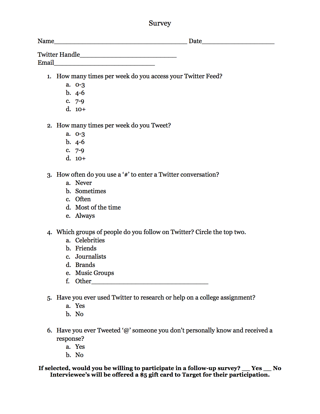 The data collection utilized both quantitative and qualitative measures through the use of a survey administered to select Journalism classes at a large urban university followed by personal interviews. The survey (See Figure 4) was administered to three Journalism classes from the university during the Spring 2013 and Fall 2013 semesters. From the three Journalism classes contacted, 25 students supplied surveys.