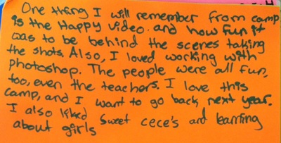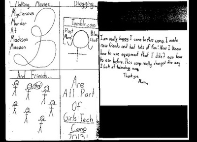 - Make time for participants and volunteers to offer assessment. A tenet of feminist scholarship is to value all voices and to make space in research for “subjects” to become active agents and participants. Adopting such a standpoint is essential in assessing a writing or technology camp in that it allows us to measure “best laid plans” not by our own perceptions but by the words and insights of those we seek to work with and for. A volunteer from GRTC 2015 is currently interviewing all those involved in planning and leading the camp to track reasons for volunteering, participant "take aways," and ideas and plans for future volunteer work.