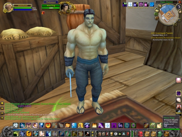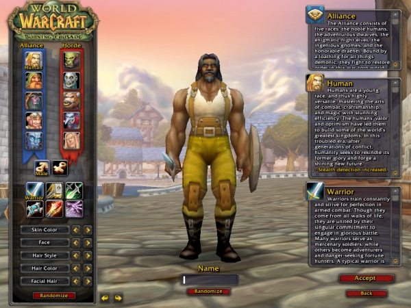 This curious ambivalence expressed by race on- and offline in World of Warcraft is here the crux. It is this ambivalence, this tension that allows for Nakamura's "mediating spaces" and that allows for the potential to make intelligible and perhaps resignify racial logics. For example, non-human races aside, humans in WoW ostensibly represent a kind of ideal, perhaps abstracted humanity -- one race out of a world of many different, distinctive, and typified races -- representing in a toonish way the range of humans possible in the real world. Humans in WoW, the most obvious connection to the real world, are cybertyped as generally Western European (given the medieval castle architecture of human cities, monarchical feudal government), default white (the character creation screen starts with a pale-skinned avatar), and heroically proportioned (superhero-like musculature, knights-in-shining-armor models). However, humanity in-game is not further subspecied. Humans are just humans regardless of their class, occupation, equipment, appearance, or skin color. In fact, humans in WoW all share the same origin, start in the same city. However, just as "human" as race is simplified, codified, and blandly multiculturalized in game, it is the intrusion of real world race that breaks the illusion of WoW's "we're all just humans" logic.