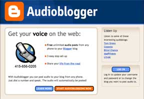 If you don't have server access, a lot of technical know-how, or a desire to work with software like Audacity or GarageBand, you can still post a simple and nearly free podcast. As you probably already know, Blogger is a service that allows users to publish blogs easily and for free. (Of course, not all blogs are on Blogger, thus my use of the somewhat awkward phrase "Blogger blog" to indicate a blog available via the Blogger service). But you might not be aware of a related service, Audioblogger, which allows users to record and automatically post audio to their Blogger blogs with just a phone call.