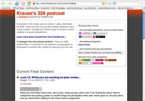 For example, the feed for my "Writing, Style, and Technology" Blogger blog where I publish my podcasts is http://feeds.feedburner.com/Krauses328Blog. Note that this is different than the URL for the blog itself; rather, this is the address for the RSS 2.0 feed. As the image above suggests, Feedburner makes it easy to subscribe to this feed with a number of other services--for example, podnova, My Yahoo!, and Odeo (the icons of which can be seen in the upper-right corner of the screenshot above). But currently, the most popular software option for subscribing to and listening to podcasts is iTunes.