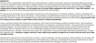 We believe that to foster response-ability, there must first be a meeting and an intention toward sharing, similar to what brought all the participants to that conference room. We approach graduate literacy through an emphasis on conversation, or the “talk” that so frequently generates affective response because we want to foster and support response-ability within academic communities. Our last section offers suggestions for doing just that.