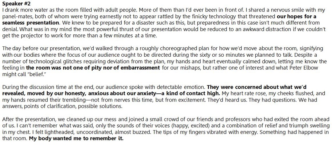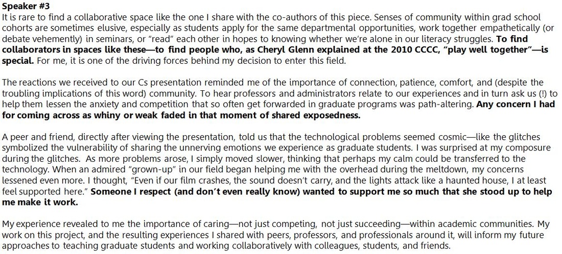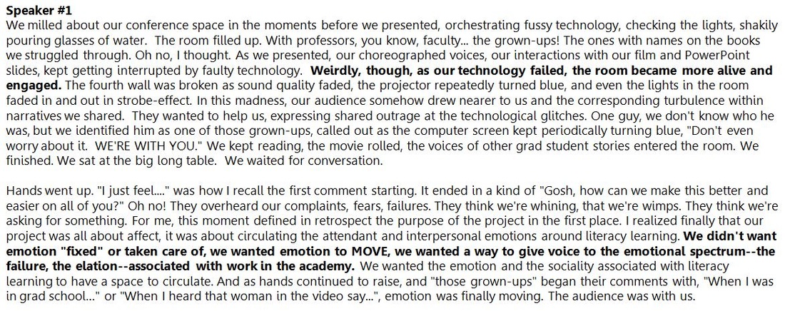 Below the film, we've included our reflections on showcasing this film to our C's audience. In large part, the claims we make in this web-text about literacy in the raw came out of the experience of sharing this project with that audience. As the reflections demonstrate, literacy began to move in that conference room as faculty offered reflections of their own experiences in school and with current writing projects, as students in the room echoed the voices they'd heard on film. We all became involved with the feelings associated with others experiences with literacy in our shared context.